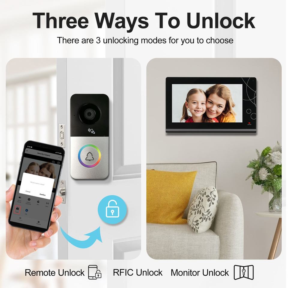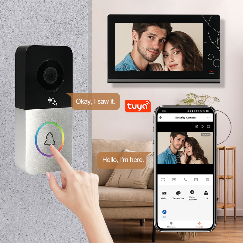 Pantalla LCD de 7 pulgadas Video intercomunicador Timbre Cámara de 3,0 millones de píxeles Botón de luz de tres colores Detección de movimiento PIR WiFi en red