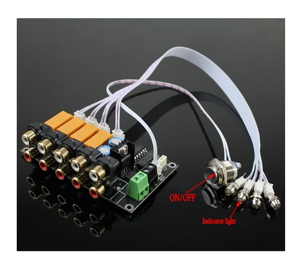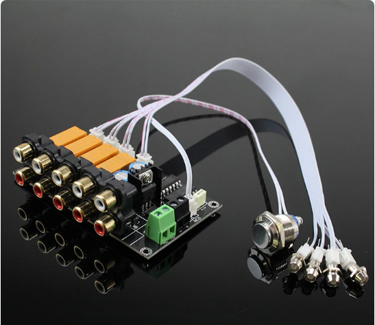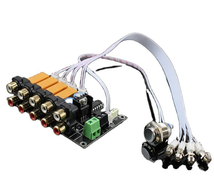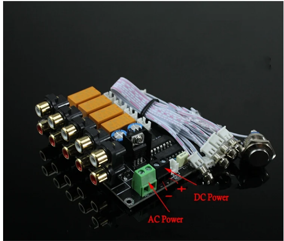 Selector de señal de entrada de Audio AC/DC, 4 entradas, 1 salida, placa de relé, placa amplificadora de conmutación de señal estéreo, RCA para altavoces