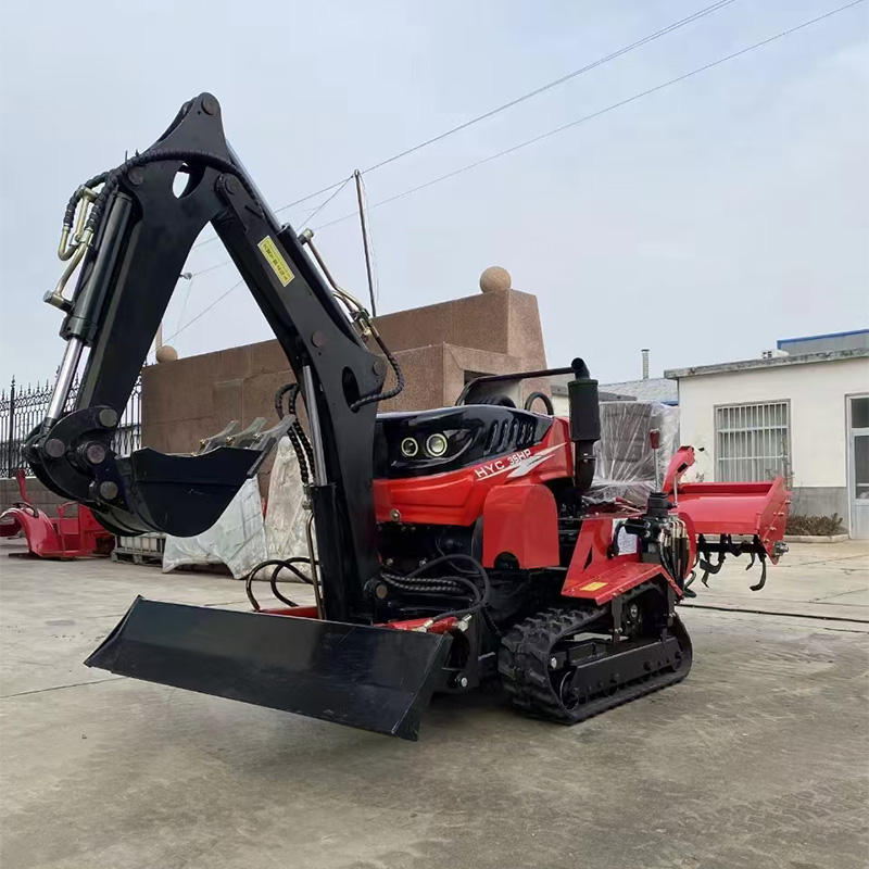 Tractor sobre orugas compacto con cargador frontal, brazo de implemento trasero, cubos de excavadora, componente de núcleo de motor