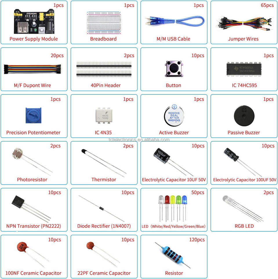 مجموعة إمداد الطاقة الأساسية للإلكترونيات + لوح الخبز + + + LED ، المقاوم + أجهزة الاستشعار + المكونات الإلكترونية المشاريع الإلكترونية