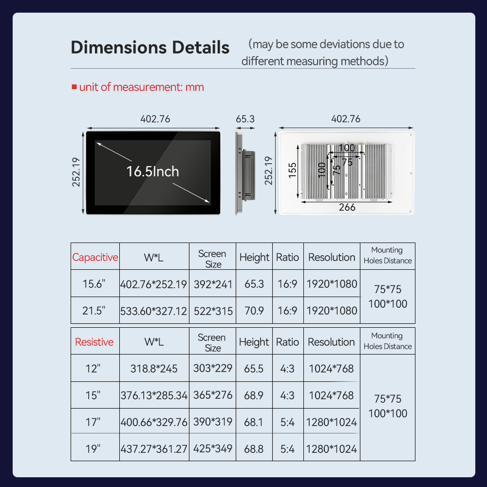 12/15/17/19"Resistive Touch Screen, 15.6/21.5" Capacitive Touch Screen