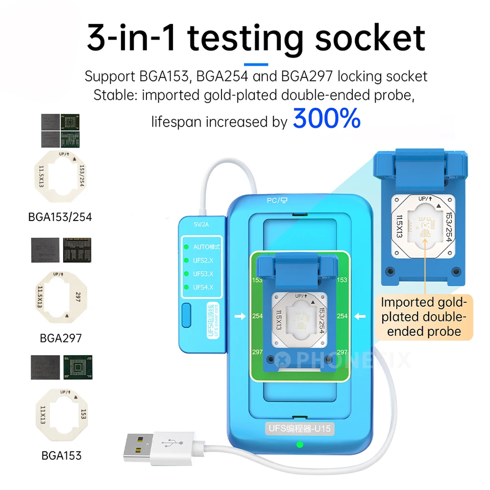 JCID UFS programador U15 caja BGA153/254/297 3 en 1 Leer escribir socket