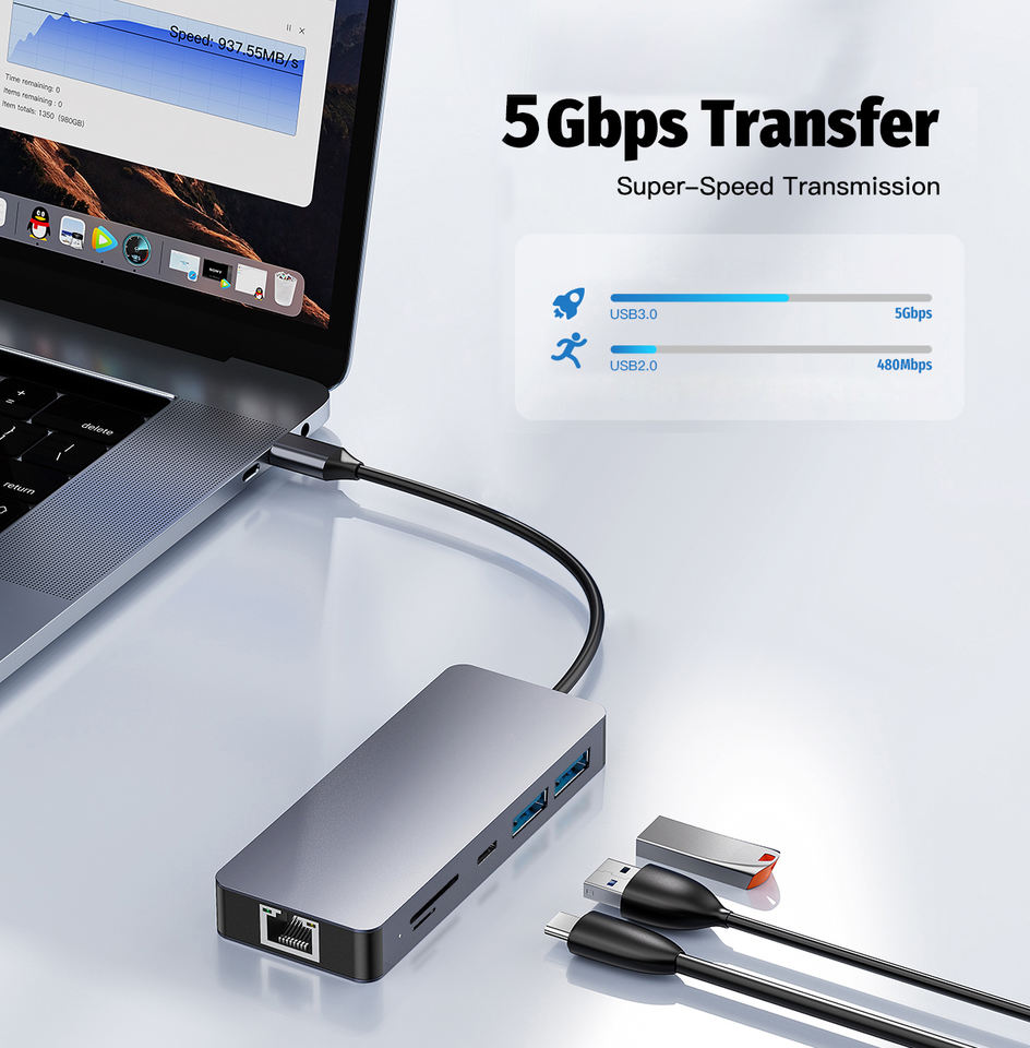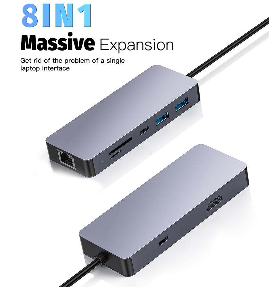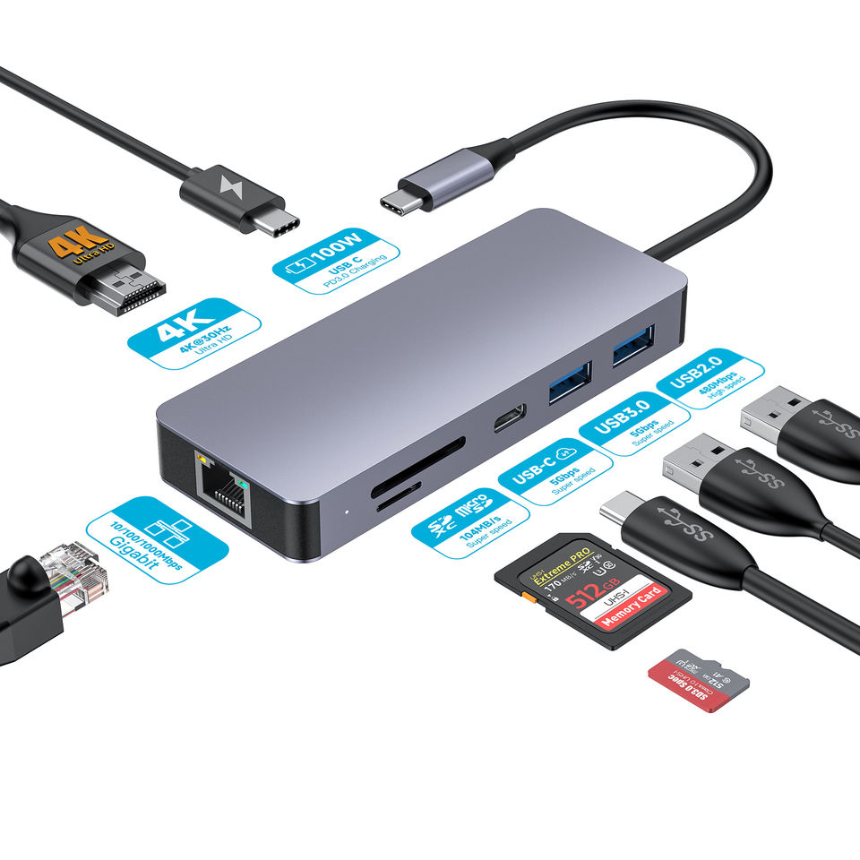 Factory Wholesale 8 in 1 USB Type C HDMI Adapter, USB C 3.2 Hubs with Ethernet RJ45 Port and 100W PD Charging Adapter